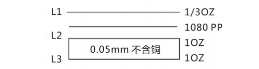 3.1.1  L2-3層采用用1OZ底銅芯板,如圖5,完成L2層線路后,選1/3 OZ銅箔進行壓合,壓合后先將L1層的1/3 OZ減銅至6-8um,然后用干膜保護L1層,再將L3層由1OZ減銅至6-8um。