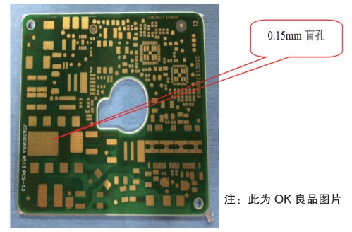 1)成品板在水平線以正常速度3m/min清洗后,盲孔區域的金面氧化嚴重,將速度降至1.5m/min仍無法克服。