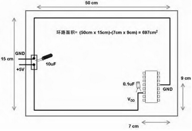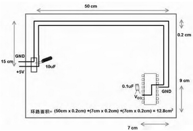 上圖通過改進——電源與地線靠近走線,減小了回路面積,降低了電磁干擾(679/12.8,約54倍)。因此,電源與地盡量應該靠近走線!而信號線之間則應該盡量避免并行走線,降低信號之間的互感效應。