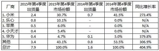 導(dǎo)致這一結(jié)果出現(xiàn)的原因主要是三種勢力的崛起,一種勢力當(dāng)然是蘋果的,盡管Apple Watch發(fā)布后飽受非議,但蘋果品牌的巨大慣性依舊無人能比。二種勢力是小米的上升。2014年,小米的發(fā)貨量僅有110萬臺,市場占有率為4%,但2015年小米市場占有率已經(jīng)達(dá)到15.4%,成為僅次于Fitbit榜上老二,而位于蘋果、Garmin和三星之前。