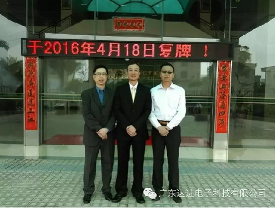 集團公司董事總經理黃永財先生、副總經理張垂榮先生、總經理助理曾擁光先生等管理層于18日早8:30帶領企業60多名管理人員在廣東達進電子科技有限公司大堂慶賀:達進東方照明控股有限公司香港股票【00515】于2016年4月18日復牌 ,并聽取黃總、張總的重要講話!