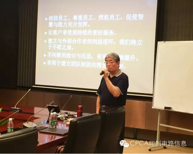 20日上午,資深專家閆海忠先生首先開講。閆海忠先生,研究員級高級工程師。曾任南方航空動力機(jī)械公司工藝員、工程師、技術(shù)室主任、分廠廠長,原深圳中航集團(tuán)下屬深南電路股份有限公司總經(jīng)理,現(xiàn)CPCA顧問。2005年~2012年在深圳中航集團(tuán)分管《管理創(chuàng)新和精益六西格瑪管理推廣》工作,具有廣泛的企業(yè)管理和精益生產(chǎn)管理經(jīng)驗(yàn)。深南電路歷年來持續(xù)推進(jìn)管理創(chuàng)新工作,各種管理方法工具諸如TQC、6S、六西格瑪、精益生產(chǎn)、項(xiàng)目管理等得到了深入、全面的應(yīng)用,管理創(chuàng)新活動和實(shí)踐敢為人先,取得了良好的成效,為先進(jìn)管理理念和方法的推廣起到了積極的垂范作用!本次專題培訓(xùn)主要由閆海忠專家傳授精益生產(chǎn)的課程,內(nèi)容包括:精益管理理念、精益生產(chǎn)管理的實(shí)質(zhì)追求、精益生產(chǎn)管理的路徑和方法。閆老師特別指出,精益生產(chǎn)不是一項(xiàng)孤立的管理工作。