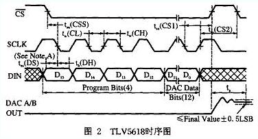 TLV5618是TI公司帶緩沖基準輸入(高阻抗)的雙路12 位電壓輸出DAC,通過CMOS 兼容的3線串行總線實現(xiàn)數(shù)字控制。器件接收16 位命令字,產生兩路D/A模擬輸出。TLV5618只有單一I/O周期,由外部時鐘SCL K決定,延續(xù)16 個時鐘周期,將命令字寫入片內寄存器,完成后即進行D/A轉換。TLV5618讀入命令字是從CS的下降沿開始有效,從下一SCLK的下降沿開始讀入數(shù)據(jù),讀入16位數(shù)據(jù)后即進入轉換周期,直到下次出現(xiàn)CS的下降沿。 其操作時序圖如圖2 所示。