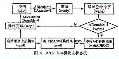 系統(tǒng)設計中,將AD、DA操作封裝成一單獨模塊,由上層控制模塊輸出命令字及控制信號啟動本模塊的相應操作,操作完成后(進入idle狀態(tài)) ,本模塊發(fā)出相應狀態(tài)信號至上層模塊。