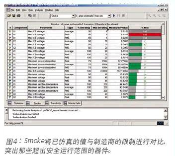 Smoke選項可以對電能耗散,連接點溫度增加,二次崩潰,或電壓/電流限制違例引起受壓的部件做出預警,經(jīng)過一定時間, 這些部件可能導致電路失敗,設計師可以用Smoke將電路仿真結(jié)果和部件的安全運行限制進行對比,如果超過限制,Smoke 就可以識別問題參數(shù),使用Smoke分析還可用于創(chuàng)建,修改和配置供使用的decrate 文件,見圖4。