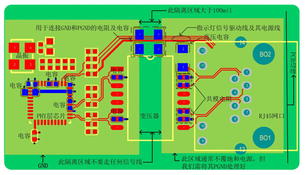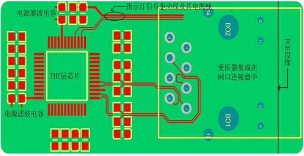 1. 圖 2網(wǎng)口變壓器沒有集成在網(wǎng)口連接器里的參考電路PCB布局、布線圖,下面就以圖 2介紹以太網(wǎng)電路的布局、布線需注意的要點。