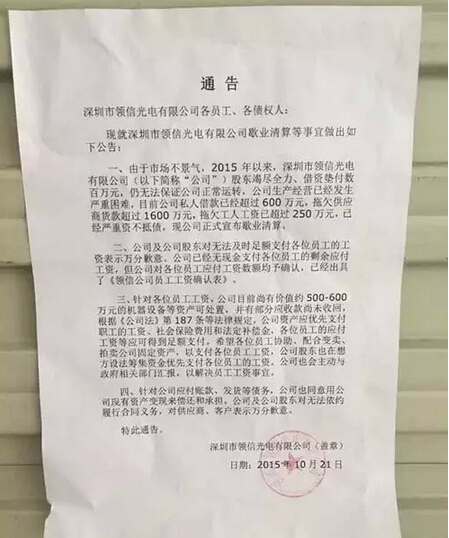 深圳領信光電倒閉 拖欠供應商款項達1600萬