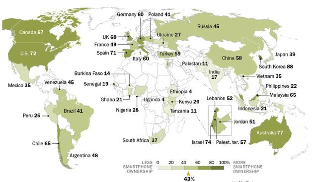 在智能手機(jī)普及率上,全球中位數(shù)為43%。