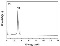 由加入還原劑硼氫化鉀和分散劑PAAS得到的納米銀樣品進(jìn)行EDX元素和SAED分析結(jié)果,分別如圖4 (a)和(b)所示。從圖4 (a)看出,得到的為純銀,無其他雜元素存在;圖4(b)的SAED分析表明,得到的納米銀是單晶,再次證明無其他氧化物或者其他晶態(tài)物質(zhì)存在。