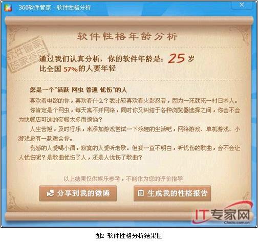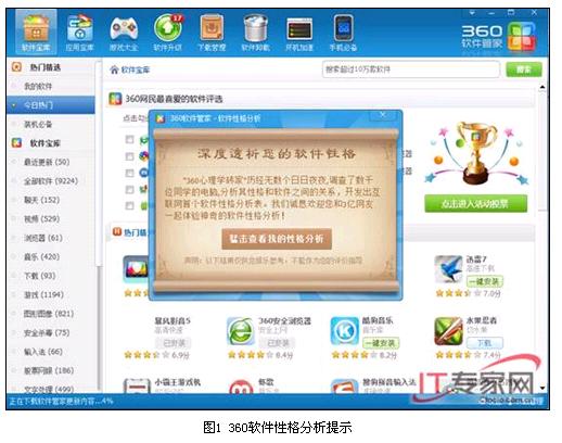 這結(jié)果給力準確嗎?神不神馬,小編馬上一試便知。安裝360安全衛(wèi)士8.5beta版后,一次運行360安全衛(wèi)士,進入“軟件管家”,“360心理學(xué)磚家”會立刻彈出一個“軟件性格分析”提示(如圖1)。